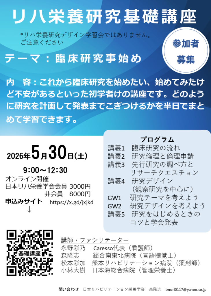 これから臨床研究を始めたい、始めてみたけど不安があるといった初学者向けの講座です。 どのように研究を計画して発表までこぎつけるかを半日でまとめて学習できます。 ※リハ栄養研究デザイン学習会ではありません。ご注意ください。